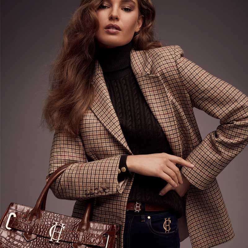 Holland Cooper clothing has a quintessentially British look. Wool, tweed and checks feature heavily, from houndstooth skirts and tailored trousers to tartan blazers and cosy gilets. Tweed accessories such as classic baker boy caps give the perfect finishing touch to any country-inspired ensemble. For men, there is everything from smart tweed waistcoats to top-quality shooting coats – all cut in flattering fits and with exquisite attention to detail.