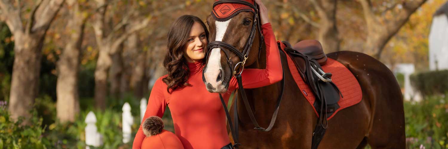 Each piece in the collection, from the plush saddle pads, base layers, hat silks, luggage, brushes, headcollars, to clothing, is imbued with the deep, warm tones of sienna. This choice of color not only adds a distinctive look to your riding gear but also brings a sense of warmth and richness to your equestrian ensemble. The collection is crafted using the finest materials, ensuring durability and functionality without compromising on style.