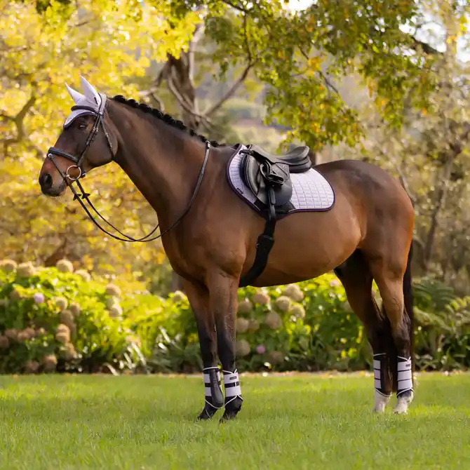 Rosemary introduces a soft, earthy green that feels natural and refined. It offers a calming tone that works across a wide range of horse coats, making it an adaptable option for everyday riding or competition. Rosemary looks stunning alongside Damson, balancing the richness of purple with a fresh, grounded contrast.