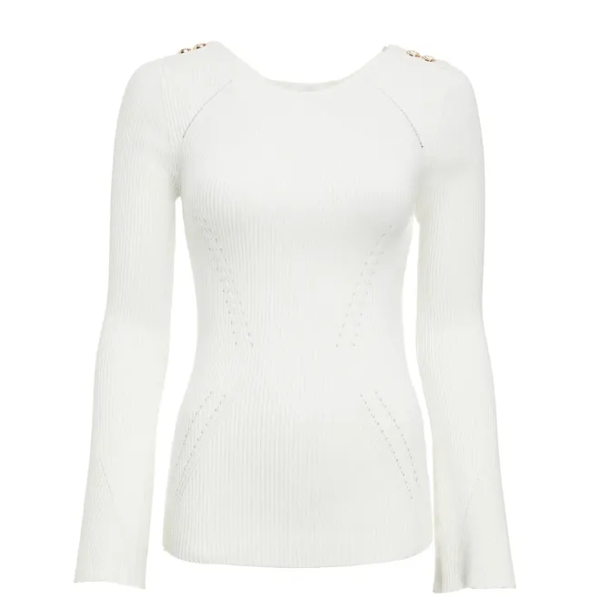 Meticulously designed with a slim silhouette and boat neck, this lightweight knit jumper is made from sumptuously soft yarn. It has a a ribbed detail on the bodice to perfectly flatter your figure, complimented by the feminine bell sleeves and finished with our iconic HC signature hardware on the shoulders.