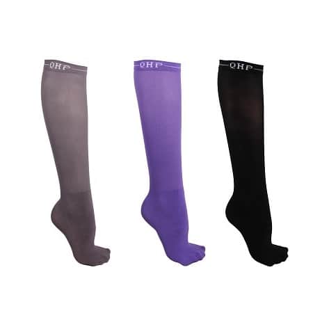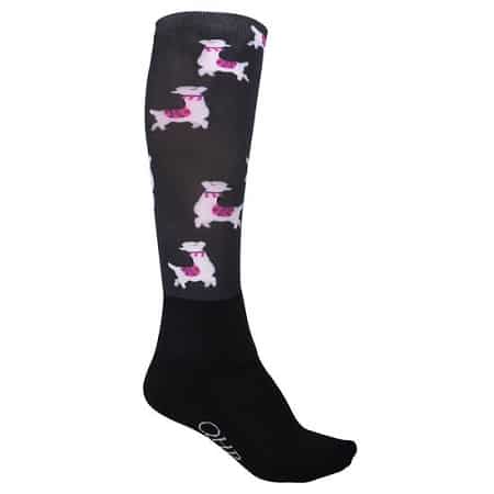 Socks with a striking print on the leg. The fabric around the calf is extra thin to fit easily into riding boots. The foot is soft and thick and the stockings support the ankle.