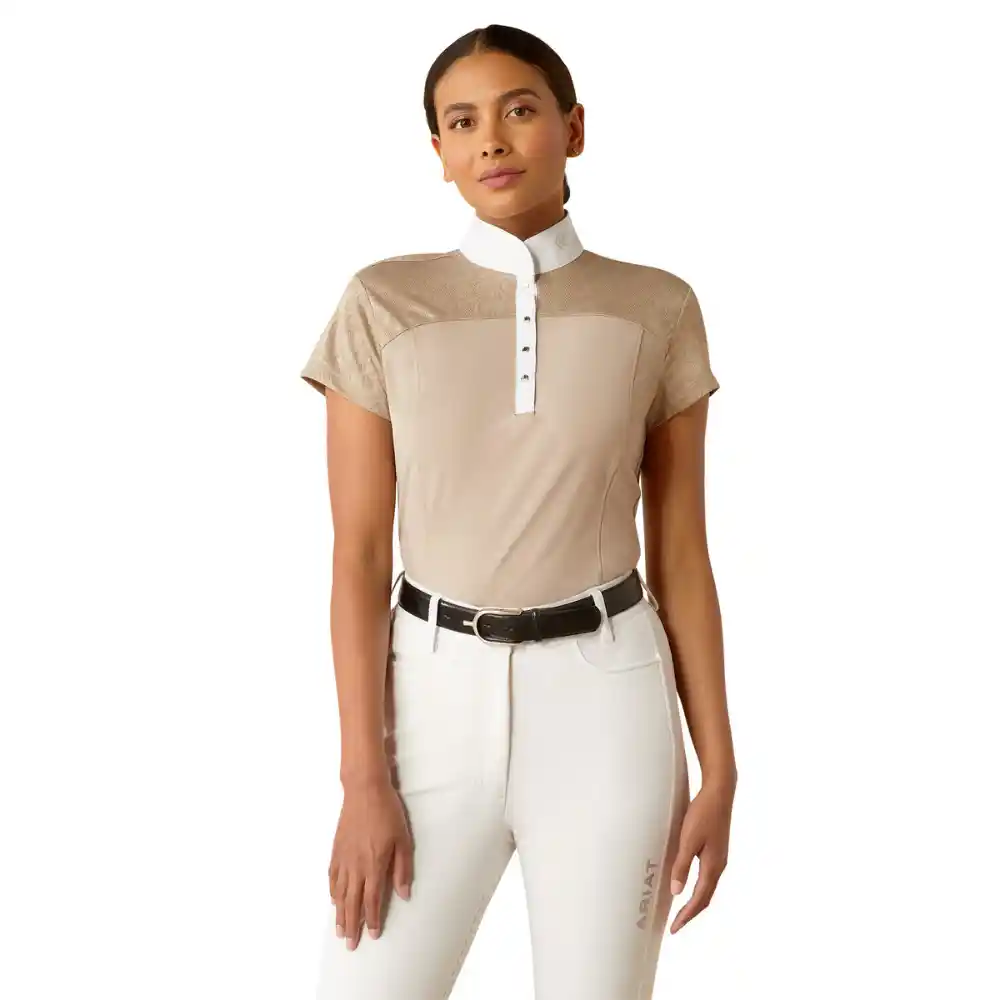 The Bellatrix Show Shirt seamlessly blends elegance and high-performance design, making it a must-have for the modern equestrian. Expertly crafted from premium, technical jersey fabric, this shirt offers exceptional breathability, stretch, and moisture-wicking properties to keep you cool and comfortable during competition. Delicate floral mesh detailing along the upper body and sleeves adds a sophisticated, fashion-forward touch, ensuring you stand out in and out of the ring. Ariat has elevated the design even further with a contemporary collar and gleaming snap closures, bringing a refined yet modern edge to this show ring staple. Whether you’re competing or simply looking to make a statement, the Bellatrix Show Shirt delivers both style and functionality in perfect harmony.