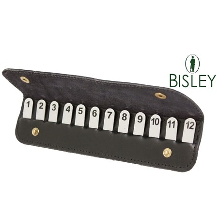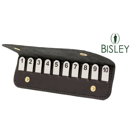 Black leather case holds ten numbered pegs. Popper fastening cover.