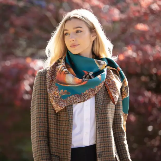 Clare Haggas A Head of the Game Large Square Silk Scarf in Teal offers the ultimate homage to Clare’s most beloved characters, all wrapped up in the most exquisite tableau of British wildlife.