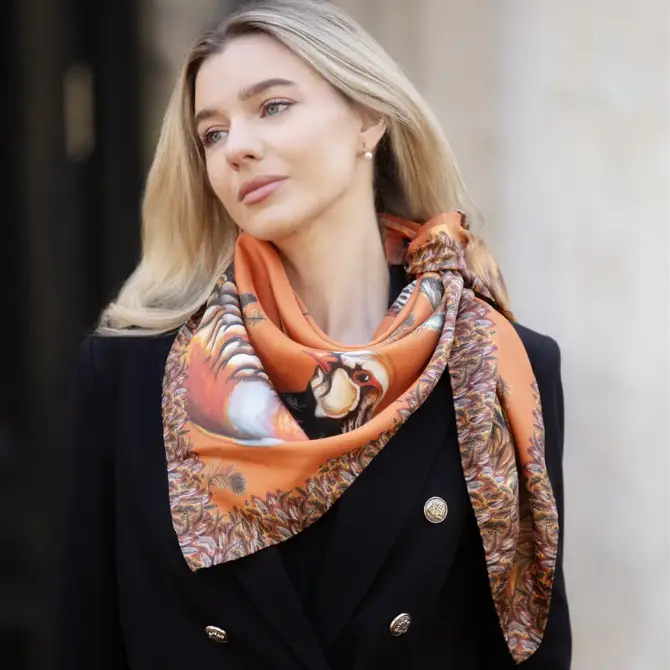Crafted from a luxurious wool-silk blend, with hand-rolled hemming, this double sided piece takes features iconic personalities from Clare’s original artworks. George the Pheasant and the beautiful hare drape down each side of the scarf, with the majestic “Caledonia” red stag sitting at the neck, joined by a handful of gamebirds and floating feathers adorning the rest of the scarf.