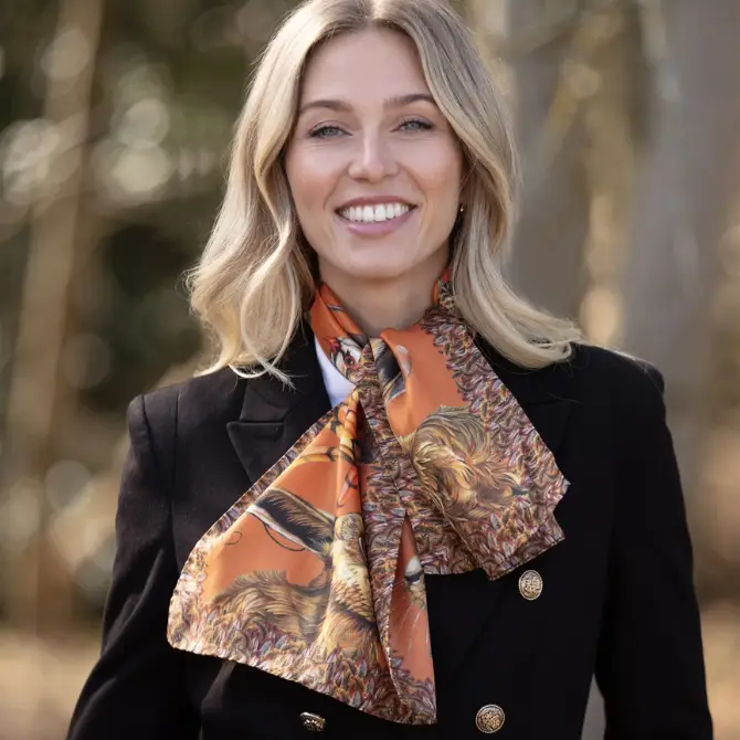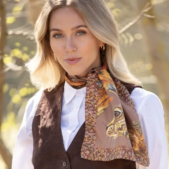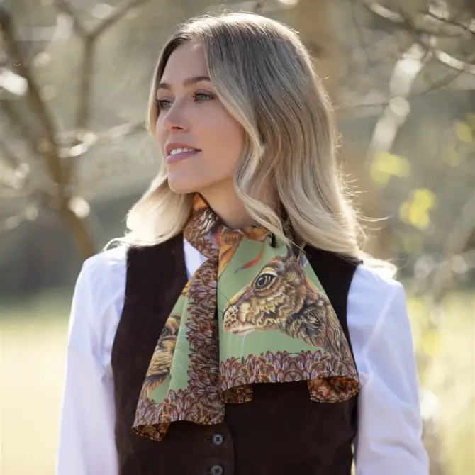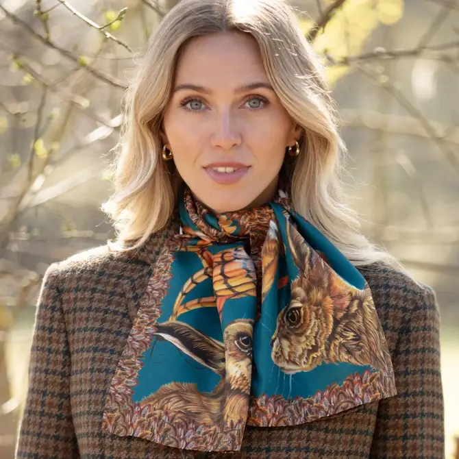 Clare Haggas A Head of the Game Narrow Silk Scarf Mocha offers the ultimate homage to Clare’s most beloved characters, all wrapped up in the most exquisite tableau of British wildlife.