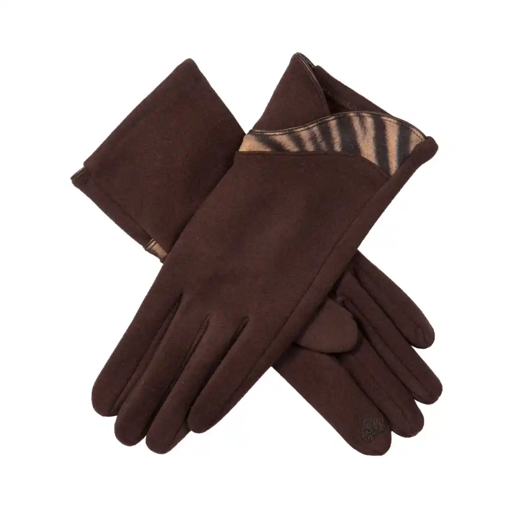 Add a fierce touch to your winter wardrobe with the Dents Ladies Touchscreen Velour Lined Gloves in Mocca, featuring a striking zebra print detail. These stylish gloves showcase a bold animal print panel that sweeps elegantly across the outer wrist, forming a distinctive V-shaped cuff. Made from a soft stretch fabric and lined with velour, they provide comfort and warmth without bulk, while the touchscreen-compatible heart-shaped touchpads on the index finger and thumb allow you to stay connected on the go.