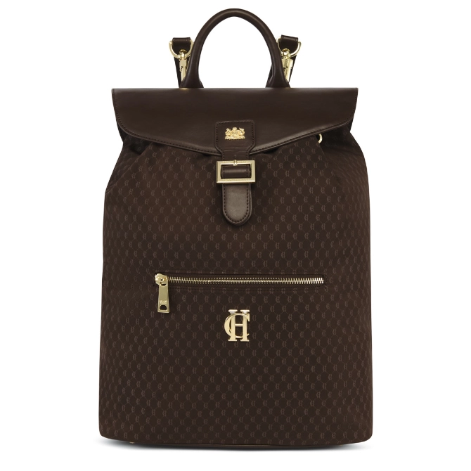 This fully branded, showerproof backpack features our iconic monogrammed upper, making a stylish statement while offering practical protection against the elements. Fully lined to guard against rain, it ensures your belongings stay dry and secure. Crafted with premium recycled PU trims and adorned with our iconic HC hardware, the Backpack seamlessly combines sustainability with luxury. Perfect for any season, this backpack is the epitome of functional elegance.
