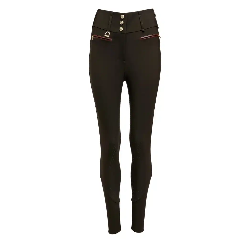 Designed to be both comfortable and practical, these breeches have been crafted from a thermal regulating Teflon fabric with a luxurious fleece lining to lock in warmth. High-waisted and made from a four way stretch fabric that lifts and contours for extra support, these breeches are both practical and stylish. With HC monogrammed silicon riding knee pads for extra grip. Adorned with our signature gold HC disc hardware.