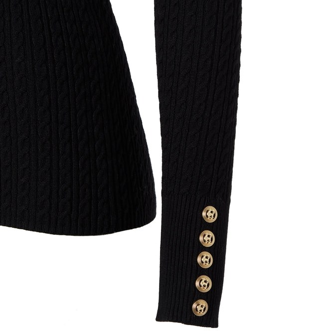 Crafted from a luxurious supersoft yarn, this jumper ensures a sumptuously cosy feel against your skin. With an intricate cable design with a slim silhouette, the monogrammed henley zip offers versatility in styling. Beautifully elevated with gold hardware on the cuffs.