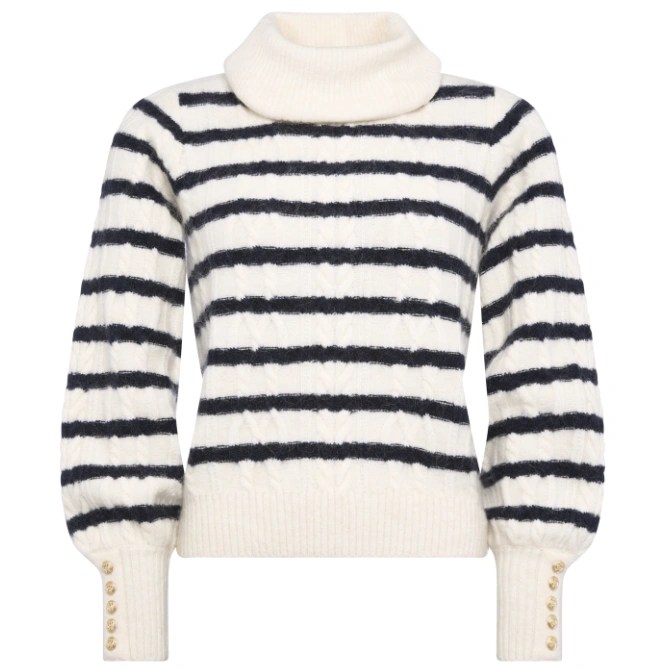 Wrap yourself in cosy sophistication with the Frances Roll Neck Knit. Crafted from a luxurious mohair blend, this relaxed-fit sweater features a soft cowl neck and blouson sleeves for effortless, elegant drape. Detailed with Breton stripes and a feature cable, the design is finished with subtle hardware at the cuffs, adding a contemporary edge to a timeless silhouette. Perfect layered or worn alone, it’s a versatile wardrobe staple with a refined, modern twist.