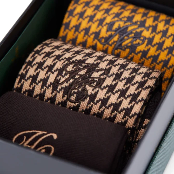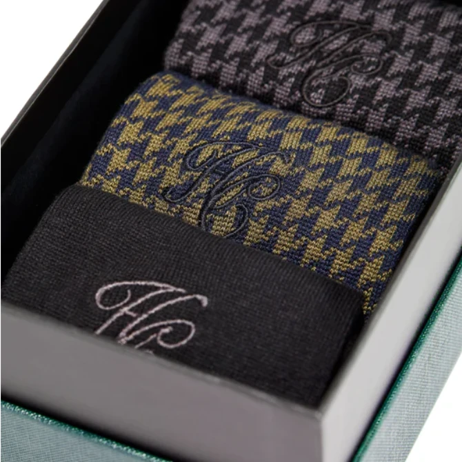 The Men’s Sock Gift Box offers a selection of classic dress socks, each crafted for a sleek, comfortable feel using premium viscose and nylon yarn. The set includes two pairs featuring traditional houndstooth checks, and one in a black solid colour. Each sock is finished with embroidered HC branding on the upper cuff, combining elegance with comfort, making it an ideal gift choice.