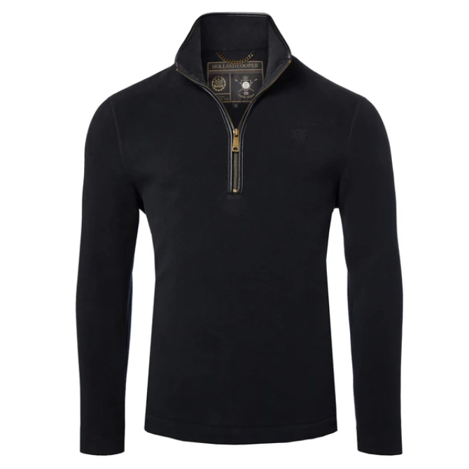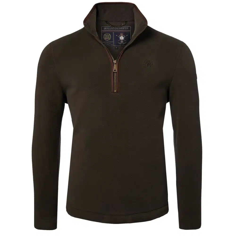 Expertly crafted from technical polar fleece fabric with a half centre zip, this piece has been designed to layer and ensure style on the coldest of days. Detailed with faux leather piping and subtle HC embroidery to the chest, the hidden seamed pockets ensure a smooth and clean fit when worn. Elevated with our iconic antique brass fastenings and metal hardware to finish the look. Layer under our Cheltenham Coat for a classic and British look.
