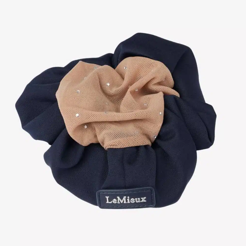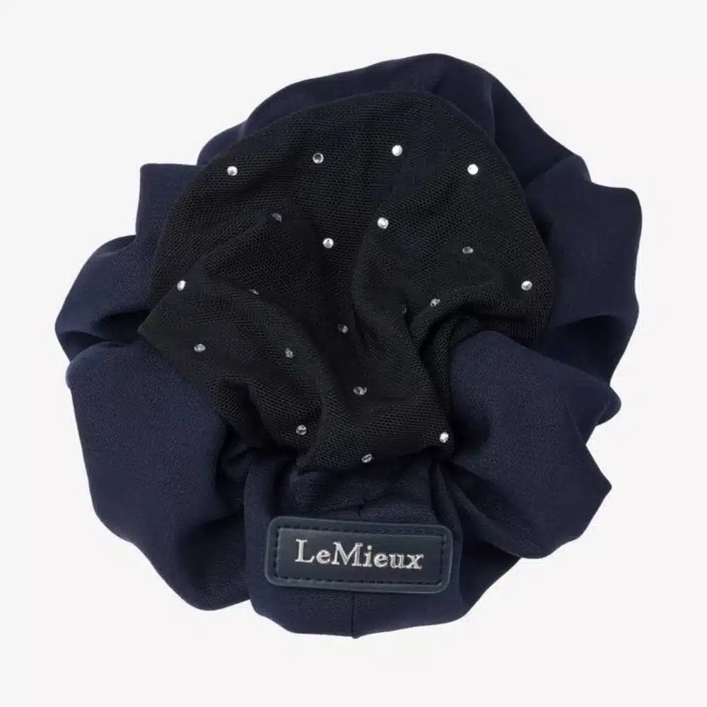 Elegant satin hair scrunchie with a LeMieux logo badge. A sewn-in hairnet adorned with sparkling crystals keeps your hair tidy while you ride, ideal for shows and events. Two hidden claw clips firmly attach to your hair.