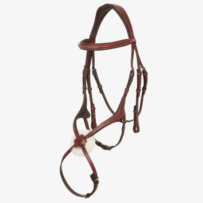 The LeMieux Grackle Bridle is a fine example of the style with the browband and noseband both featuring decorative stitching and soft padding for comfort on the brow and along the bridge of the nose.