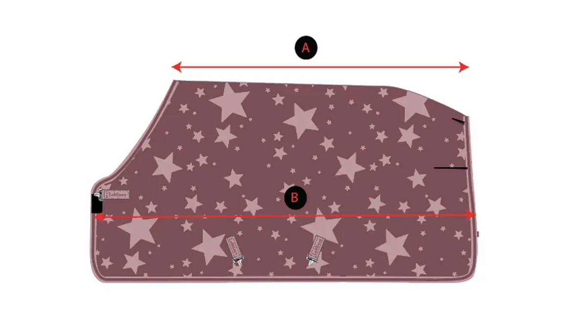 Green, pink, white and silver stripe binding gives a cute look. A single T-bar front closure is backed with hook and loop tape for security and a single surcingle will keep the rug in place round your pony’s belly. A soft cord fillet strong secures the rear.