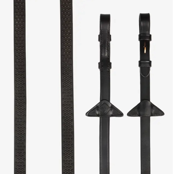 Simple and easy to use, these reins are a popular choice for lower-level riders or fast work. They’re complemented by the branded LeMieux Leather martingale Stoppers.