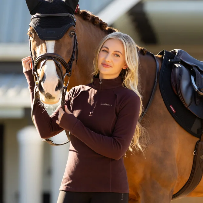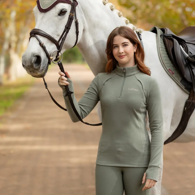 A quarter zip neck and thumbholes lend athletic wear style points, as does contrast colour LeMieux branding.