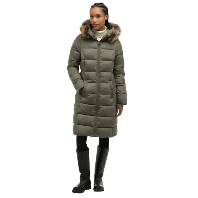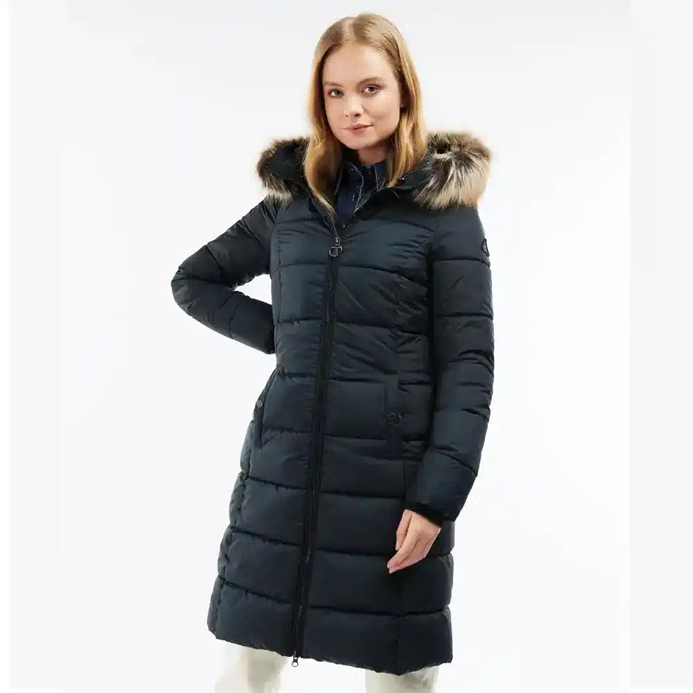 The jacket features a secure internal zipped pocket and two handwarmer pockets for added practicality. A 2-way full-length YKK® zip is complemented by ‘Barbour’ branded press-studs and a ‘Barbour and Beacon’ branded zip pull. Filled with Barbour Fibre Down insulation, the long-length jacket is crafted from a smooth, fully quilted fabric for exceptional comfort. It also includes a fixed, quilted, and adjustable hood complete with a removable faux-fur trim.