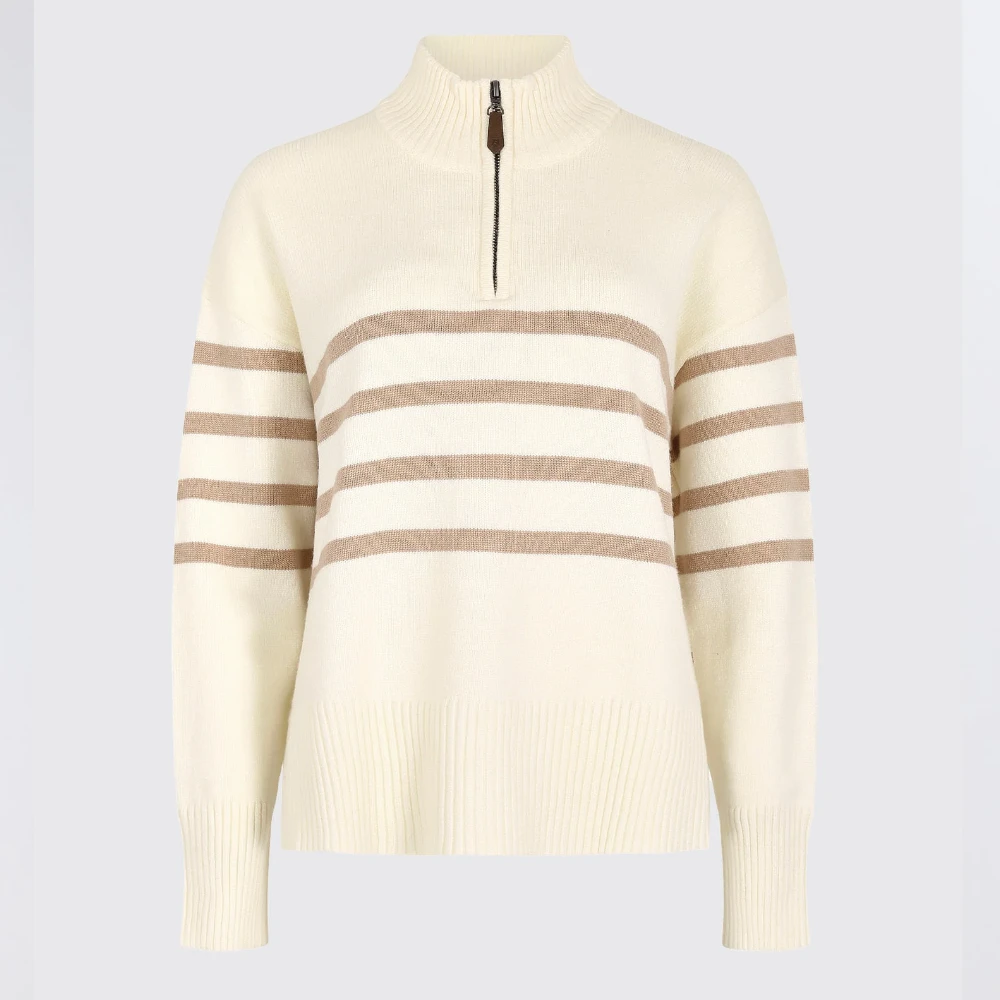 The Fonthtill sweater is lightweight and wonderfully soft, made with a combination yarn designed to be soft to the touch, hold its shape well and be machine washable. The crisp contrasting stripes have a distinct nautical feel, very at home by the sea, but bring a fresh spring touch wherever you take it. The ribbed collar can be zipped up or down giving you a light spring layer that’s also cosy on cooler spring evenings.