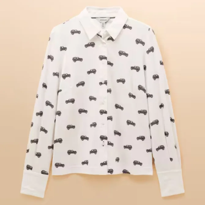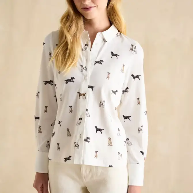 The Joules Ladies X Eleanor Tomlinson Jersey Shirt in Cream Dog pairs everyday comfort with exclusive country-inspired artistry, making it a standout piece that’s effortlessly versatile for both casual and smart country looks.