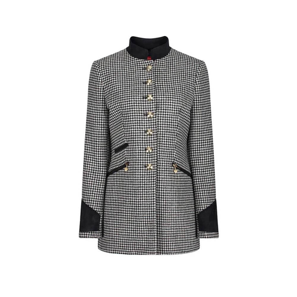 Introducing the Knightsbridge Elemental Wool Jacket – a luxurious blend of light blue wool with a subtle pink and darker blue check pattern. Adorned with our signature WG cuffs and collar, and featuring elegant crown zipper pockets with intricate lion embroidery. Elevate your style with this exclusive piece.