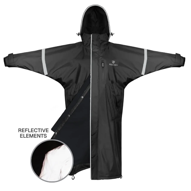 The EQUIDRY Evolution with thin fleece lining is designed to be worn oversized and full length so it covers the top of your boots but features an adjustable waist so you can choose an oversized style or cinch the coat in for a more tailored look.