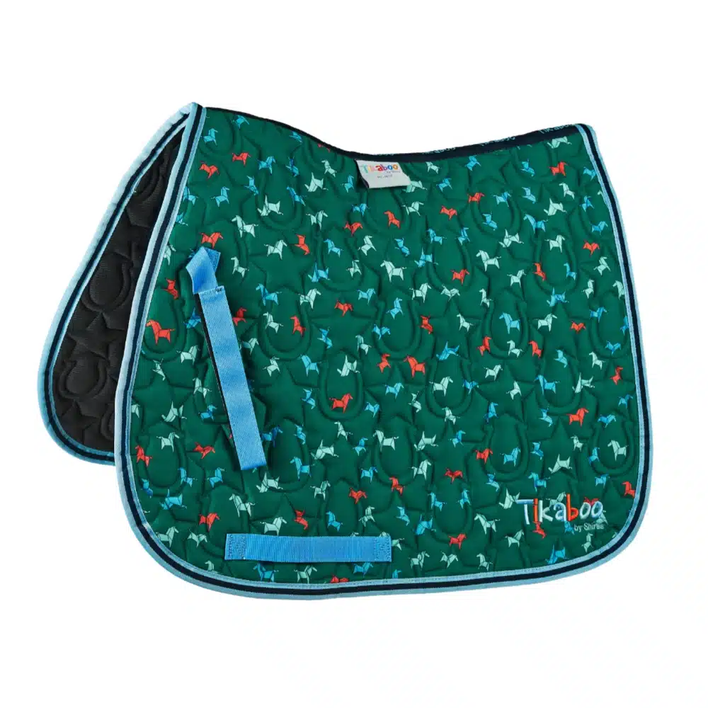 These fun saddle pads coordinate with the Tikaboo clothing range. Embroidered design, touch close retaining straps and contoured shape.