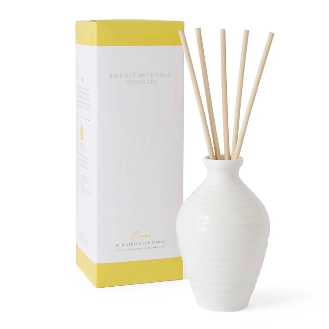 The white rippled finish of this Frankincense and Vetivert ceramic Reed Diffuser by Sophie Conran has an artisan hand-thrown feel. Coupled with the bright and herbal fragrance, it’s sure to have a calming influence in any room. The scent opens with clary sage that leads to a powdery heart of violet, while sweet notes of iris rest on a woody base of patchouli and frankincense.