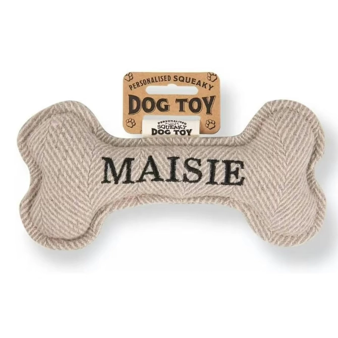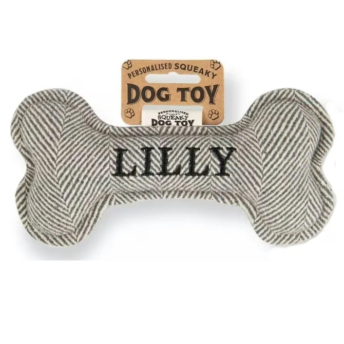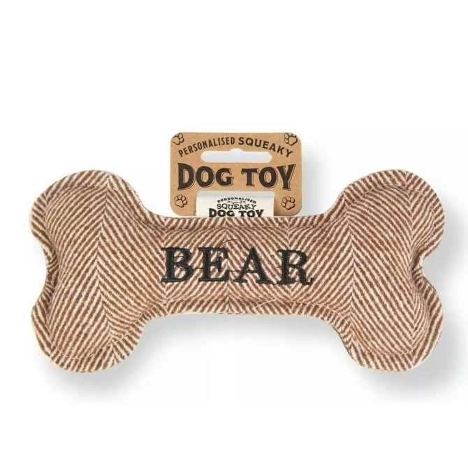 Crafted with your furry friend in mind, this adorable toy combines the timeless appeal of a bone shape with the playful squeak that dogs love.Made from a blend of durable of double hemmed tweed material in muted colourways and embroidered with black thread.