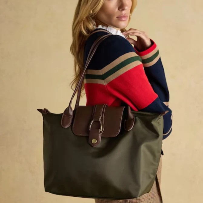 The Joules Edie Shopper Bag in Khaki A deceptively spacious bag that stands out thanks to its quality. Heritage-inspired trims elevate it further. A zip fastening keeps all of your items secure, whilst an inside pocket is a great place for stashing smaller items such as keys and cards. Perfect for a trip to the shops, weekend away or even the daily commute.