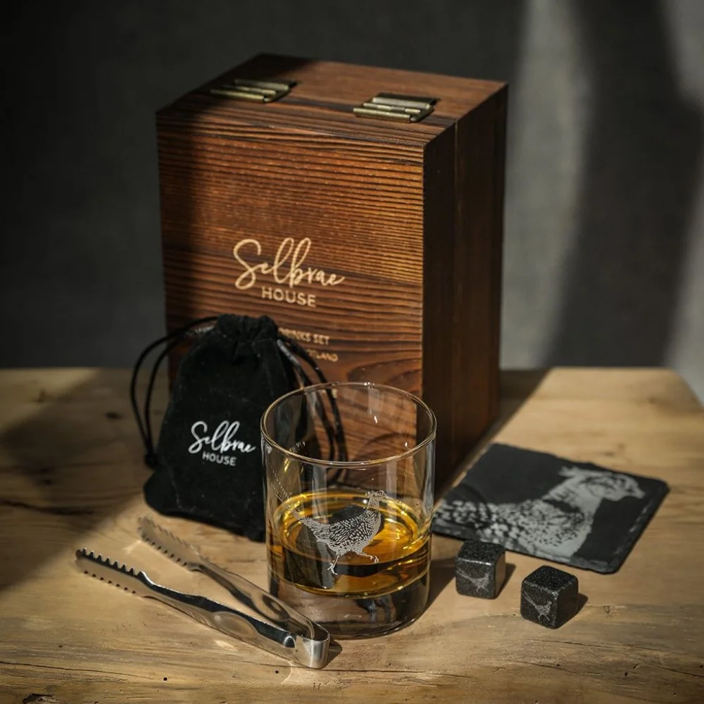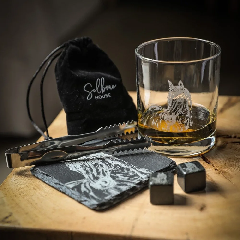 This set includes a horse engraved coaster, alongside a horse printed whisky tumbler and whisky stones. The set comes complete with mini tongs and a branded velvet pouch used for storing the whisky stones, which will allow you to cool your drink without diluting it. Presented in a beautiful rustic wood gift box, this set it perfect for displaying in drinks cabinets and on drinks trolleys. A tasteful gift for those who enjoy a little tipple.