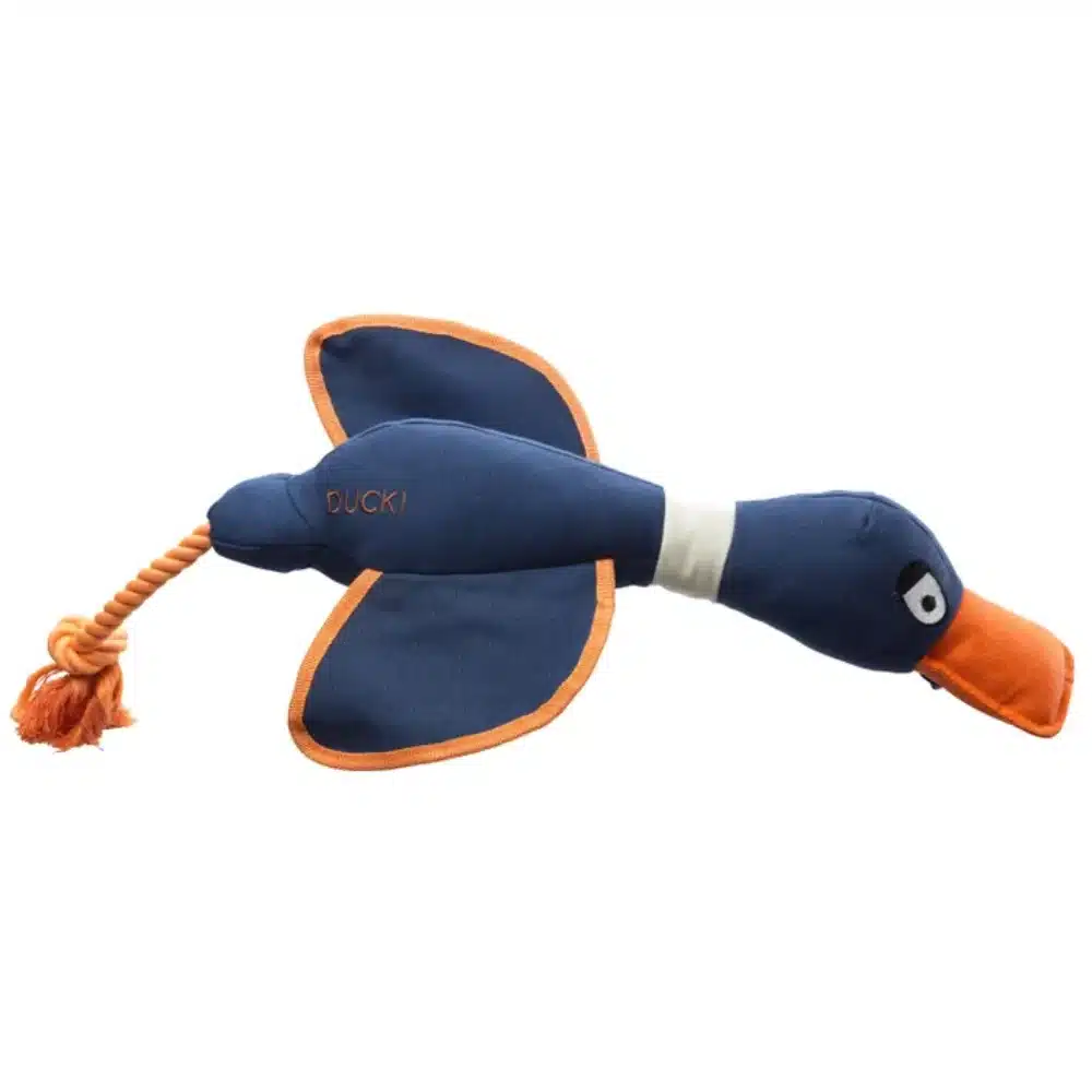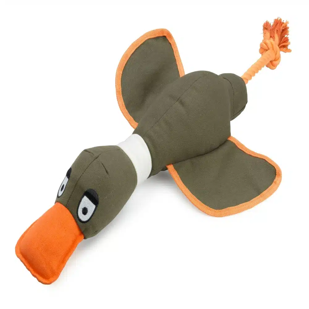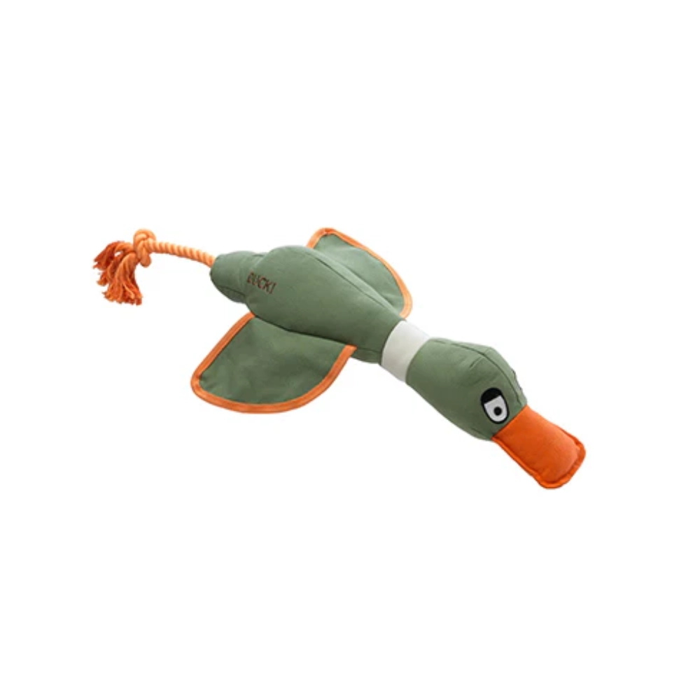 Duck! Karki thrower duck themed dog toy. Fun canvas duck with rope tail ideal to throw for your dog.