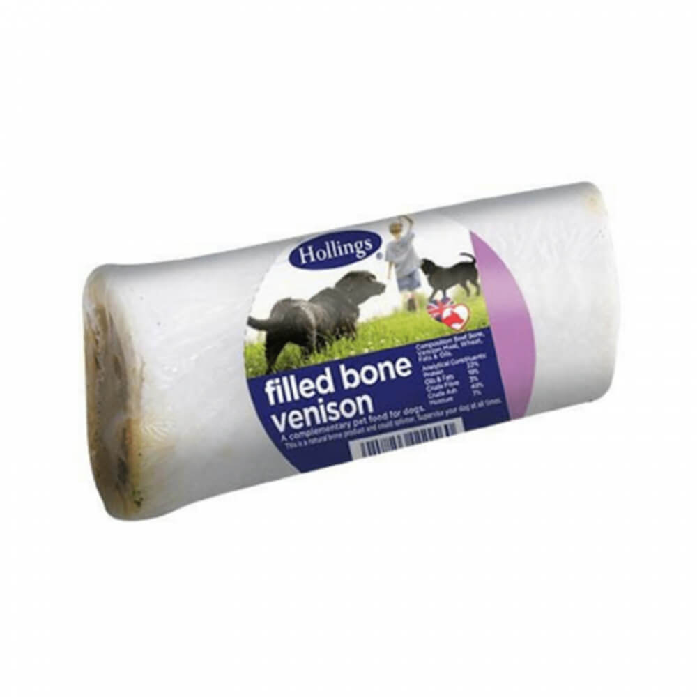 Hollings Venison Filled Bone Venison Dog Chews are quality air dried treats for dogs filled with a 100% natural venison flavoured meat filling, sourced locally from British bones and manufactured in our own factory. The venison filling can tempt any dog into giving these bones a good chew and nibble which can help rub plaque and tartar off their pearly whites.